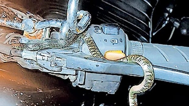 തൊടുപുഴ: അടിമാലിയില് പാമ്പിന്റെ കടിയില് നിന്ന് തലനാരിഴയ്ക്ക് രക്ഷപ്പെട്ട് യുവാവും കുടുംബവും. ബൈക്കില് പാമ്പ് കയറിക്കൂടിയതറിയാതെ ഭാര്യയും മകളുമായി യുവാവ് അഞ്ചുകിലോമീറ്റര് ദൂരമാണ് സഞ്ചരിച്ചത്. മഴ കനത്തതോടെ ഭാര്യയെയും മകളെയും കാറില് കയറ്റിവിട്ടശേഷം വീട്ടിലേക്കു വരുംവഴി ബൈക്കിന്റെ ക്ലച്ചിലാണ് പാമ്പിനെ കണ്ടത്.