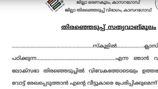ലോക്സഭാ തെരഞ്ഞെടുപ്പിൽ വിവേകത്തോടെയും ഉത്തരവാദിത്വത്തോടെയും വോട്ട് ചെയ്യാൻ വീട്ടുകാരെ പ്രേരിപ്പിക്കുമെന്നു പ്രതിജ്ഞ ചെയ്യുന്നു എന്നു എഴുതി വിദ്യാർഥി ഒപ്പിടണം. ഉത്തരവാദിത്വപ്പെട്ട പൗരൻ എന്ന നിലയിൽ വോട്ട് രേഖപ്പെടുത്തുമെന്നു പ്രതിജ്ഞ ചെയ്യുന്നു എന്ന് എഴുതി രക്ഷിതാവും ഒപ്പിടണം. 26നു ജില്ലയിലെ മുഴുവൻ വിദ്യാർഥികളും നിശ്ചിത മാതൃകയിൽ പ്രതിജ്ഞ തയ്യാറാക്കണെന്നാണ് നിർദ്ദേശം.