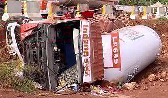 ഏഴിലോട് ദേശീയ പാത വികസനം നടക്കുന്നിടത്താണ് അപകടമുണ്ടായത്. മംഗലാപുരത്തു നിന്നും കോഴിക്കോട്ടേക്ക് എല്പിജിയുമായി പോവുകയായിരുന്ന ലോറിയാണ് അപകടത്തില്പ്പെട്ടത്.