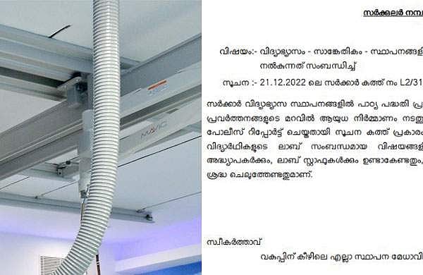 സാങ്കേതിക വിദ്യാഭ്യാസ വകുപ്പിന് കീഴിലെ എല്ലാ സ്ഥാപനമേധാവികള്ക്കുമാണ് ഡയറക്ടറുടെ നിര്ദ്ദേശം. പ്രവൃത്തി പരിചയത്തിന്റെ മറവില് ആയുധനിര്മ്മാണം നടക്കുന്നതായി എഡിജിപിയുടെ റിപ്പോര്ട്ട് ഉണ്ടെന്ന് സര്ക്കുലറില് പറയുന്നു. ലാബുമായി ബന്ധപ്പെട്ട വിഷയങ്ങളില് കൃത്യമായ നിരീക്ഷണവും മേല്നോട്ടവും ഉണ്ടാകണമെന്ന് ഉത്തരവില് നിര്ദ്ദേശിക്കുന്നു. അധ്യാപകരും ലാബ് ജീവനക്കാരും ഇക്കാര്യം ശ്രദ്ധിക്കണമെന്നാണ് ഉത്തരവിലുള്ളത്. സ്ഥാപനമേധാവികളും പ്രത്യേക ശ്രദ്ധ ചെലുത്തണമെന്ന് സാങ്കേതിക വിദ്യാഭ്യാസ ഡയറക്ടര് ഇന് ചാര്ജ് ഡോ. ബൈജുഭായ് ടിപി നിര്ദ്ദേശിച്ചു.