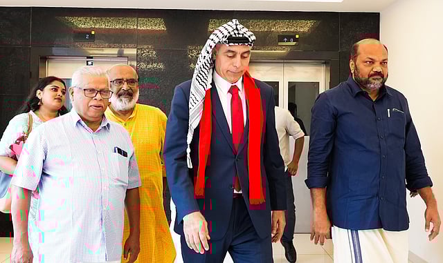 തിരുവനന്തപുരം: ഇന്ത്യയിലെ പലസ്തീന് അംബാസഡര് അബ്ദുള്ള അബു ഷാവേഷിന് എകെജി സെന്ററില് സ്വീകരണം. സിപിഎം നേതാക്കളായ ഡോ. ടി എം തോമസ് ഐസക്, പി രാജീവ്, പുത്തലത്ത് ദിനേശന്, ജോണ് ബ്രിട്ടാസ് എംപി, എം വി ജയരാജന്, സി എന് മോഹനന്, കെ ജയചന്ദ്രന് എന്നിവര് ചേര്ന്നാണ് സ്വീകരിച്ചത്