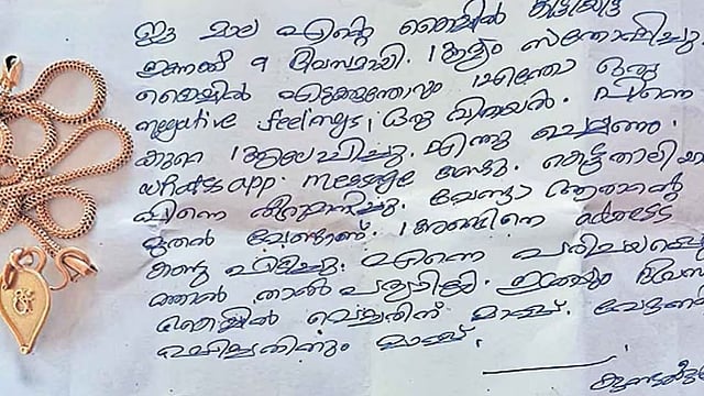 ഇന്നലെ രാവിലെ പത്തരയ്ക്ക് ഗീതയും ദാമോദരനും പൊയ്നാച്ചിയിലേക്ക് പോകാന് ഇറങ്ങുമ്പോഴാണ് വരാന്തയിലെ ഇരിപ്പിടത്തില് കുറിപ്പും സ്വര്ണവും കണ്ടത്. കത്തിന് താഴെ സമീപത്തെ സ്ഥലനാമമായ കുണ്ടം കുഴി എന്നെഴുതിയിട്ടുണ്ട്.