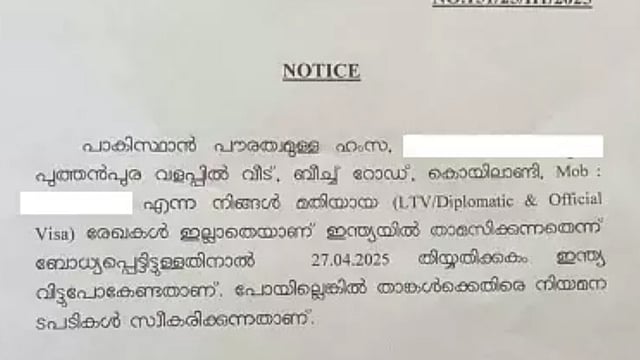 കൊയിലാണ്ടിയില് താമസിക്കുന്ന ഹംസ,വടകര വൈക്കിലിശ്ശേരിയില് താമസിക്കുന്ന കഞ്ഞിപ്പറമ്പത്ത് ഖമറുന്നീസ, സഹോദരി അസ്മ എന്നിവര്ക്കാണ് നോട്ടീസ് ലഭിച്ചത്. കറാച്ചിയില് കച്ചവടം നടത്തിയിരുന്ന ഇവരുടെ കുടുംബം പിതാവ് മരിച്ച ശേഷം 1993-ലാണ് കേരളത്തില് എത്തിയത്. കണ്ണൂരില് താമസിക്കുകയായിരുന്ന ഖമറുന്നീസ 2022-ലാണ് വടകരയില് എത്തിയത്. അസ്മ ചൊക്ലിയിലാണ് താമസം. 2024-ല് വിസയുടെ കാലാവധി കഴിഞ്ഞതിനാല് വിസയ്ക്ക് അപേക്ഷിച്ചെങ്കിലും ലഭിച്ചില്ലെന്നാണ് ഇരുവരും പറയുന്നത്.