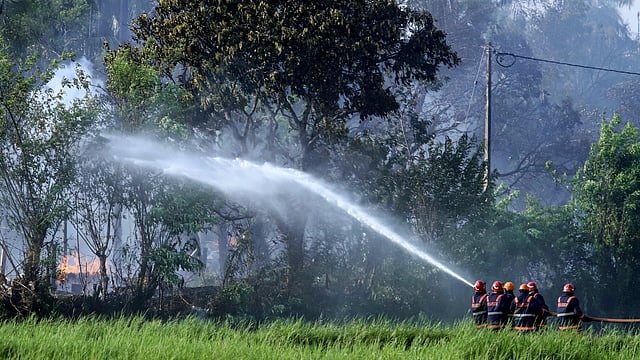 എന്നാല്, വെടിക്കെട്ടുപുര സ്ഥിതി ചെയ്യുന്ന പറമ്പിന്റെ പരിസരത്തേക്ക് അടുക്കാന് കഴിയാത്തവിധം കുഴിമിന്നലും ഡൈനയും രണ്ടര മണിക്കൂറോളം തുടര്ച്ചയായി പൊട്ടി. പാടത്തുകൂടി ഫയര് എന്ജിനുകളെത്തിച്ചു ഘട്ടംഘട്ടമായി വെള്ളം ചീറ്റിച്ച് അപകടസാധ്യത കുറച്ചശേഷം 6 മണിയോടെയാണ് രക്ഷാപ്രവര്ത്തകര്ക്ക് ഉള്ളില് കടക്കാന് കഴിഞ്ഞത്. ആറരയോടെ തീ നിയന്ത്രണവിധേയമാക്കി.