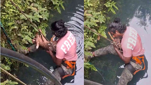 വനംവകുപ്പ് സംഘത്തിന് ഒപ്പം സംഭവസ്ഥലത്ത് എത്തിയ വന്യജീവിസംരക്ഷകനായ ലിജോ കാച്ചേരിയാണ് മാന് കുട്ടിയെ രക്ഷപ്പെടുത്തിയത്. റോപ്പ് ക്ലാമ്പിങ് ഉപയോഗിച്ച് കിണറില് തൂങ്ങിയിറങ്ങിയ ലിജോ നീന്തി അവശനായ മാന്കുഞ്ഞിനെ കൈകളിലാക്കുകയായിരുന്നു. കിണറില് വച്ച് തന്നെ സിപിആര് ഉള്പ്പെടെ നല്കിയാണ് ഉദ്യോഗസ്ഥര് മാന്കുട്ടിയുടെ ജീവന് നിലനിര്ത്തിയത്. വായ്കൊണ്ട് കൃത്രിമ ശ്വാസം നല്കിയും നെഞ്ചിന്റെ ഭാഗത്ത് അമര്ത്തിയുമായിരുന്നു പ്രാഥമിക ശുശ്രൂഷ. പൂര്ണ ആരോഗ്യം തിരിച്ചെടുത്ത മാന്കുഞ്ഞിനെ തൊട്ടടുത്ത കാട്ടിലുണ്ടായിരുന്ന അമ്മ മാനിന്റെ അടുത്ത് എത്തിക്കുകയും ചെയ്തു. പിഎഫ്ഒ അനില്കുമാര്, പ്രവീണ്, എന്നിവരുടെ നേതൃത്വത്തിലായിരുന്നു രക്ഷാപ്രവര്ത്തനം.