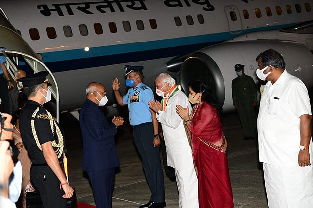 സതേണ് എയര് കമാന്ഡ് എ ഒ കമാന്ഡിങ് ഇന് ചീഫ് എയര് മാര്ഷല് ജെ ചലപതി, സംസ്ഥാന പൊലീസ് മേധാവി അനില്കാന്ത്, പൊതുഭരണ വകുപ്പ് പ്രിന്സിപ്പല് സെക്രട്ടറി കെ ആര് ജ്യോതിലാല്, സിറ്റി പൊലീസ് കമ്മിഷണര് ജി സ്പര്ജന് കുമാര്, ജില്ലാ കലക്ടര് ഡോ. നവ്ജ്യോത് ഖോസ എന്നിവരും രാഷ്ട്രപതിയെ സ്വീകരിക്കാന് എത്തി.