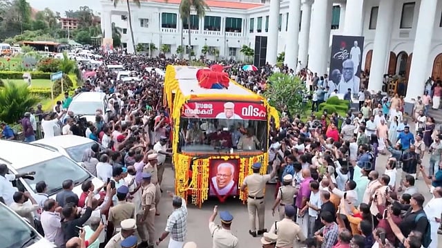 ദര്ബാര് ഹാളില് നിന്നും ദേശീയപാത വഴിയാണ് വി എസ് അച്യുതാനന്ദന്റെ വിലാപയാത്ര പോകുന്നത്. വിലാപയാത്ര കടന്നുപോകുന്ന വഴികളില് തങ്ങളുടെ പ്രതീക്ഷയുടെ കെടാത്തിരി നാളമായി നിലകൊണ്ട വിപ്ലവനായകന് അന്ത്യാഞ്ജലി അര്പ്പിക്കാനായി ജനസഹസ്രങ്ങളാണ് കാത്തു നിന്നത്. സിപിഎം സംസ്ഥാന സെക്രട്ടറി എം വി ഗോവിന്ദനും മറ്റ് മുതിര്ന്ന നേതാക്കളും വിലാപയാത്രയെ അനുഗമിക്കുന്നുണ്ട്. തിരുവനന്തപുരത്ത് 27 പ്രധാന ഇടങ്ങളില് വിഎസിന്റെ ഭൗതികദേഹം പൊതുജനങ്ങള്ക്ക് കാണാനും അന്തിമോപചാരം അര്പ്പിക്കാനും സൗകര്യം ഒരുക്കിയിട്ടുണ്ട്. കൊല്ലത്ത് ഏഴിടങ്ങളിലും പൊതുജനങ്ങള്ക്ക് കാണാന് അവസരമുണ്ട്.