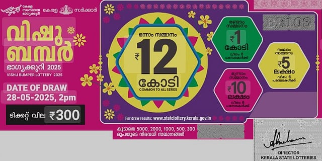 12 കോടി രൂപ ഒന്നാം സമ്മാനം നൽകുന്ന സംസ്ഥാന സർക്കാർ വിഷു ബമ്പർ (Vishu Bumper) (ബി ആർ - 103) ഭാഗ്യക്കുറിയുടെ നറുക്കെടുപ്പ് 28 ന് ഉച്ചയ്ക്ക് 2 ന് നടക്കും. വില്പനയ്ക്കായി വിപണിയിൽ എത്തിച്ച 45 ലക്ഷം ടിക്കറ്റുകളിൽ തിങ്കളാഴ്ച നാലു മണിക്കുള്ളിൽ 42,17,380 ടിക്കറ്റുകളും വിറ്റു പോയിട്ടുണ്ട്. 300 രൂപ വില്പന വിലയുള്ള വിഷു ബമ്പർ ടിക്കറ്റുകൾ മൊത്തം ആറു പരമ്പരകളിലായാണ് വിപണിയിൽ എത്തിയത്.
