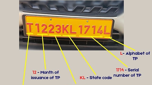 ഇതില് 'T ' താല്ക്കാലികത്തെയാണ് സൂചിപ്പിക്കുന്നത്, തുടര്ന്നുള്ള അക്കങ്ങള് മാസത്തെയും വര്ഷത്തെയുമാണ് കാണിക്കുന്നത്. 'KL ' സ്റ്റേറ്റ് കോഡ്, തുടര്ന്നുള്ള അക്കങ്ങള് താല്ക്കാലിക നമ്പര് എന്നിങ്ങനെയാണ് സൂചിപ്പിക്കുന്നതെന്നും മോട്ടോര് വാഹനവകുപ്പ് വിശദീകരിക്കുന്നു.