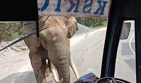 വണ്ടിയുടെ മുന്വശത്ത് നിലയുറപ്പിച്ച ആനയെക്കണ്ട് യാത്രക്കാര് ഭയന്നെങ്കിലും ഡ്രൈവര് ബാബുരാജ് മനസ്സാന്നിധ്യം കൈവിട്ടില്ല. തുമ്പിക്കൈ ഉയര്ത്തിയും മറ്റും ബസിനു മുന്നില് അല്പനേരം തുടര്ന്ന ആനയുടെ കൊമ്പുരഞ്ഞ് വണ്ടിയുടെ മുന്വശത്തെ ഗ്ലാസില് പൊട്ടലുണ്ടായി. ആന വശത്തേക്കു മാറിയയുടന് ബസുമായി ഡ്രൈവര് മുന്നോട്ടു പോകുന്നതും മറ്റും യാത്രക്കാരില് ഒരാള് പകര്ത്തിയ വിഡിയോയില് വ്യക്തമാണ്. സുപ്രിയം സാഹു ഐഎഎസ് ട്വിറ്ററില് പങ്കുവെച്ച വീഡിയോയാണ് ഇപ്പോള് വ്യാപകമായി പ്രചരിക്കുന്നത്.