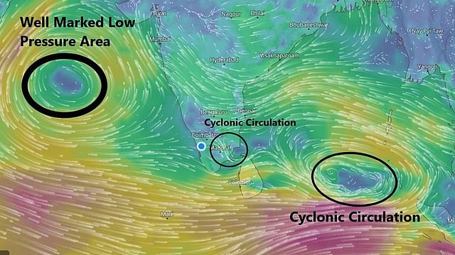 വടക്കന് തമിഴ്നാടിനു മുകളില് ചക്രവാതച്ചുഴി സ്ഥിതിചെയ്യുന്നു. തെക്ക് കിഴക്കന് ബംഗാള് ഉള്ക്കടലിലെ ചക്രവാതച്ചുഴി നാളെയോടെ പടിഞ്ഞാറന് ബംഗാള് ഉള്ക്കടലിന്റെ മധ്യ ഭാഗത്തു ന്യുനമര്ദ്ദമായി ശക്തി പ്രാപിക്കാനും സാധ്യതയുണ്ട്. തുടര്ന്നു ശക്തി പ്രാപിച്ച് വടക്കന് തമിഴ്നാട്, പുതുച്ചേരി, തെക്കന് ആന്ധ്രാ തീരത്തേക്ക് നീങ്ങിയേക്കും.