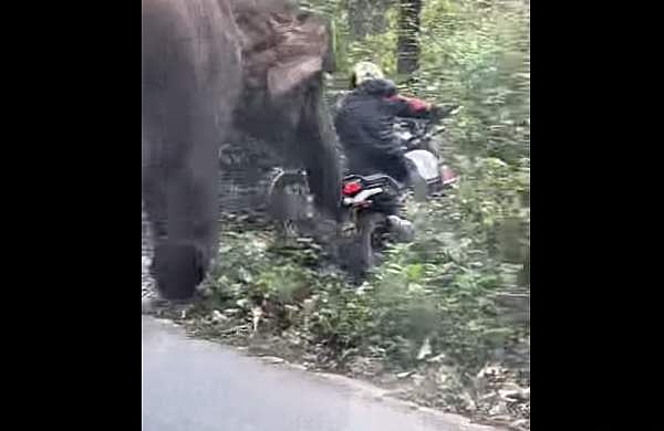 മറ്റു വാഹനത്തിലുള്ളവര് ഹോണ് അടിച്ചും മറ്റും യുവാക്കള്ക്ക് മുന്നറിയിപ്പ് നല്കാന് ശ്രമിച്ചെങ്കിലും അപ്പോഴേക്കും ആന തൊട്ടടുത്തെത്തി. ഇതോടെ യുവാക്കളില് ഒരാള് ഓടിമാറി. ബൈക്കിലുണ്ടായിരുന്ന യുവാവ് വാഹനം വേഗം മുന്നേട്ടെടുക്കാനും ശ്രമിച്ചു. എന്നാല് ആന പിന്നാലെ വന്നതോടെ നിയന്ത്രണംവിട്ട ബൈക്ക് റോഡരികിലുള്ള കാട്ടില് ഉപേക്ഷിച്ച് യുവാവ് ഓടിമറയുകയായിരുന്നു. ഓടിമാറിയ യുവാവ് റോഡിലുണ്ടായിരുന്ന കാറില് കയറിയാണ് രക്ഷപ്പെട്ടത്.