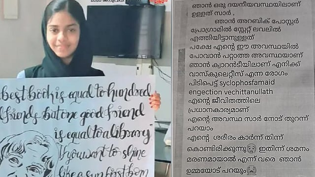 കാസര്കോട് പടന്ന വികെപികെഎച്ച്എംഎംആര് വിഎച്ച്എസ്എസിലെ വിദ്യാര്ഥിനിയാണ് എല് കെ സിയ ഫാത്തിമ. ശനി പകല് 11ന് സിഎംഎസ് ഹയര്സെക്കന്ഡറി സ്കൂളിലാണ് മത്സരം. രക്തക്കുഴലുകളെ ബാധിക്കുന്ന 'വാസ്കുലൈറ്റിസ്' എന്ന രോഗമാണ് സിയയ്ക്ക്. ഉയര്ന്ന അളവില് കീമോയും സ്റ്റിറോയ്ഡുകളും നല്കുന്നതിനാല് ക്വാറന്റൈനിലാണ്. കാസര്കോട് ജില്ലാ കലോത്സവത്തില് ഒന്നാംസ്ഥാനം നേടിയിരുന്നു. അതിനുശേഷമാണ് രോഗം സ്ഥിരീകരിച്ചത്.