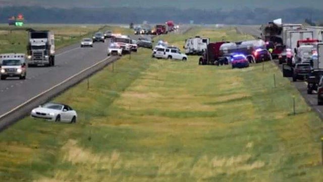 ഹാർഡിന് പടിഞ്ഞാറ് അഞ്ച് കിലോമീറ്റർ അകലെ മൊണ്ടാന ദേശീയപാതയിലാണ് അപകടമുണ്ടായത്. വെള്ളിയാഴ്ച വൈകിട്ട് നാലരയോടെയാണ് സംഭവം. ആതിശക്തമായ കാറ്റിനെത്തുടർന്ന് കാഴ്ച മറഞ്ഞതാണ് അപകടത്തിന് കാരണം.