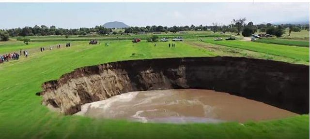 കിണര് ഇടിഞ്ഞുതാഴ്ന്നു, റോഡില് ഗര്ത്തം രൂപപ്പെട്ടു എന്നിങ്ങനെ പ്രകൃതി പ്രതിഭാസങ്ങളുടെ നിരവധി വാര്ത്തകള് പുറത്തുവന്നിട്ടുണ്ട്. എന്നാല് മെക്സിക്കോയില് നിന്നുള്ള വാര്ത്ത സാധാരണനിലയിലുള്ളതല്ല. പാടത്തിന്റെ മധ്യത്തില് രൂപപ്പെട്ട ഗര്ത്തം ഏവരെയും അമ്പരിപ്പിക്കുകയാണ്. തുടക്കത്തില് പത്ത് അടി മാത്രം വിസ്തൃതി ഉണ്ടായിരുന്ന ഗര്ത്തം മണിക്കൂറുകള്ക്കുള്ളില് 300 അടിയിലേറെ വലിപ്പമുള്ള ഒരു കരിങ്കല് ക്വാറി കണക്കിനാണ് വികസിച്ചത്.