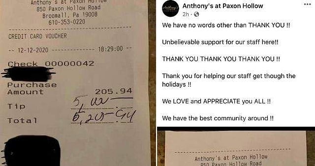 5000 യുഎസ് ഡോളര് (3.67 ലക്ഷം) ആണ് പെന്സില്വാനിയയിലെ ഇറ്റാലിയന് റസ്റ്റോറന്റായ 'ആന്തണീസ്'ന് ലഭിച്ചിരിക്കുന്നത്. ഇവര് തന്നെയാണ് സാമൂഹിക മാധ്യമങ്ങളിലൂടെ ഇക്കാര്യം അറിയിച്ചത്. തങ്ങളോട് കസ്റ്റമര് കാണിച്ച കരുതലിന് നന്ദി പറഞ്ഞുകൊണ്ട് ഫെയ്സ്ബുക്കില് പങ്കുവച്ച പോസ്റ്റ് വൈകാതെ തന്നെ വൈറലാവുകയായിരുന്നു.