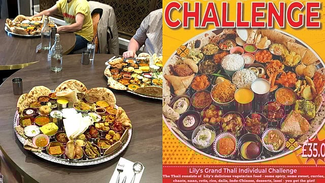 24 ഇഞ്ച് പ്ലേറ്റില് 50 വിഭവങ്ങള് നിരത്തിയിരിക്കുന്ന ഭീമന് താലി ഒരു മണിക്കൂറിനുള്ളില് തിന്നു കാണിക്കണമെന്നതാണ് ചലഞ്ച്. ഗ്രേറ്റര് മാഞ്ചസ്റ്ററിലെ ലില്ലീസ് വെജിറ്റേറിയന് റെസ്റ്റോറന്റാണ് ചലഞ്ച് സംഘടിപ്പിച്ചത്. എട്ടു വ്യത്യസ്ത തരത്തിലുള്ള റൊട്ടി, മൂന്ന് ഇനം ചോറ്, 16 കറികള്, ആറ് ഡെസേര്ട്ടുകള് അടക്കം വിഭവ സമൃദ്ധമായ താലിയാണ് ഭക്ഷണപ്രിയര്ക്കായി കാത്തിരിക്കുന്നത്. 3611 രൂപയാണ് ഇതിന് വിലയിട്ടിരിക്കുന്നത്.