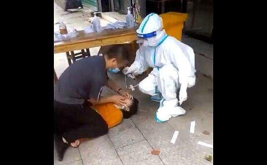 മറ്റൊരു വീഡിയോയിൽ പ്രായമായ ഒരു സ്ത്രീയെ ആരോഗ്യ പ്രവർത്തകർ ബലമായി പിടിച്ചുനിർത്തി സ്രവ സാംപിൾ ശേഖരിക്കുന്നത് കാണാം. ആരോഗ്യപ്രവർത്തകരെ ചവിട്ടിയും തള്ളിമാറ്റിയും സ്ത്രീ പ്രതിരോധിക്കാൻ ശ്രമിക്കുന്നുണ്ടെങ്കിലും കൂട്ടം ചേർന്ന് ആരോഗ്യപ്രവർത്തകർ സ്ത്രീയെ ബലപ്രയോഗത്തിലൂടെ കീഴടക്കിയാണ് കോവിഡ് പരിശോധന പൂർത്തിയാക്കുന്നത്. ചൈനീസ് ആരോഗ്യ പ്രവർത്തകർ കഴിഞ്ഞ മാസം ഒരു വയോധികന്റെ വീട്ടിൽ കടന്നുകയറി ബലം പ്രയോഗിച്ച് കോവിഡ് പരിശോധന നടത്തുന്ന വീഡിയോയും വൈറലായി മാറിയിരുന്നു.