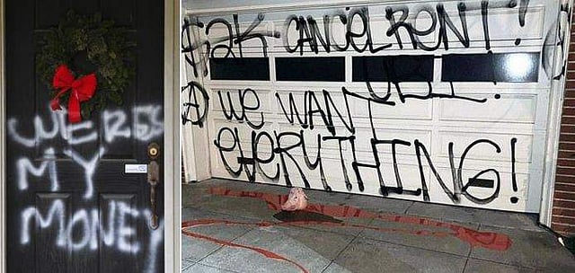 വീടുകളുടെ ചുവരുകളിൽ എഴുതുകയും പെയിന്റ് ഒഴിക്കുകയും ചെയ്തിട്ടുണ്ട്. നാൻസി പെലോസിയുടെ വീടിനുമുന്നിൽ പന്നിയുടെ തല നിക്ഷേപിച്ചതായും അമേരിക്കൻ മാധ്യമങ്ങൾ റിപ്പോർട്ട് ചെയ്തു. 'എന്റെ പണം എവിടെ', 'പാവങ്ങളെ മിച്ച് കൊല്ലുന്നു' എന്നിങ്ങനെയാണ് മിച്ച് മക് കോണലിന്റെ കെന്റക്കിയിലുള്ള വീടിന്റെ ചുവരുകളിൽ എഴുതിയിരിക്കുന്നത്. നാൻസി പെലോസിയുടെ സാൻ ഫ്രാൻസിസ്കോയിലുള്ള വീടിനു മുന്നിൽ ചായം ഒഴിക്കുകയും പന്നിയുടെ തല നിക്ഷേപിക്കുകയും ചെയ്തിട്ടുണ്ട്.