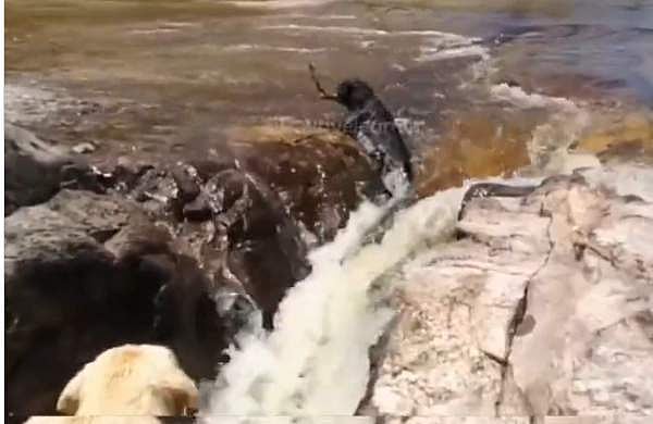 വെള്ളച്ചാട്ടത്തിന് അരികിലായി നിന്ന കറുത്ത നായ കരയിലേക്ക് കയറാൻ ശ്രമം നടത്തിയെങ്കിലും വെള്ളത്തിന്റെ ഒഴുക്കിൽ നടന്നില്ല. അധികം വൈകാതെ തന്നെ നായ വെള്ളത്തിലേക്ക് വീഴുകയായിരുന്നു. തൊട്ടപ്പുറത്തെ പാറയിൽ ഇതെല്ലാം കണ്ടുനിന്ന നായ അവനെ രക്ഷിക്കാനായി കാത്തിരിക്കുകയായിരുന്നു. തന്റെയടുത്ത് ഒഴുകിയെത്തിയ നായയുടെ വായിലെ കമ്പ് വെളുത്ത നായ കടിച്ചുപിടിച്ചു.