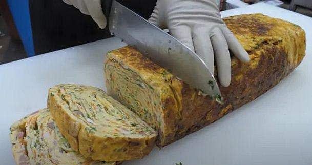 ഒരു പാത്രത്തില് 60 മുട്ടകള് ഉടച്ച് ഒഴിക്കുന്നതാണ് വീഡിയോയുടെ തുടക്കത്തില്. തുടര്ന്ന് ഉപ്പിട്ട് പാത്രത്തിലെ മുട്ട നന്നായി ഇളക്കുന്നു. ഇതിലേക്ക് ചേരുവകള് ഓരോന്നായി ചേര്ക്കുന്നതാണ് അടുത്ത പടി. അരിഞ്ഞ് ചെറിയ കഷ്ണങ്ങളാക്കിയ സവാള, ചീര പോലെ അരിഞ്ഞ് ക്യാരറ്റ്, ഇറച്ചിക്കഷ്ണങ്ങള്, തുടങ്ങി നിരവധി വിഭവങ്ങള് ചേര്ത്താണ് ഇത് പാകം ചെയ്യുന്നത്. അവസാനം ബ്രെഡ് പോലെയാക്കി ഇത് ഓരോ കഷ്ണങ്ങളായി മുറിക്കുന്നതാണ് വീഡിയോയിലെ ഏറ്റവും മികച്ച ദൃശ്യം. യമ്മി ബോയി എന്ന പേരിലാണ് ഇത് സോഷ്യല്മീഡിയയില് അപ്ലോഡ് ചെയ്തിരിക്കുന്നത്.