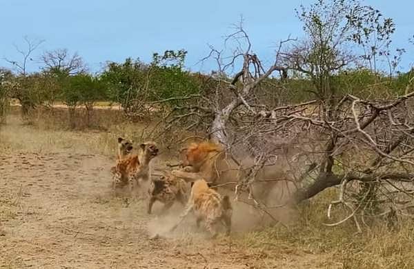 കഴുതപ്പുലിയെ ഭക്ഷണമാക്കാന് ഒരുങ്ങുന്നതിനിടെയാണ്, കൂട്ടാളികള് കഴുതപ്പുലിയുടെ രക്ഷയ്ക്ക് എത്തിയത്. കഴുതപ്പുലികള് കൂട്ടത്തോടെ ആക്രമിക്കാന് എത്തിയതോടെ രക്ഷയില്ലാതെ സിംഹത്തിന് ഇരയെ വെറുതെ വിടേണ്ടി വന്നു.