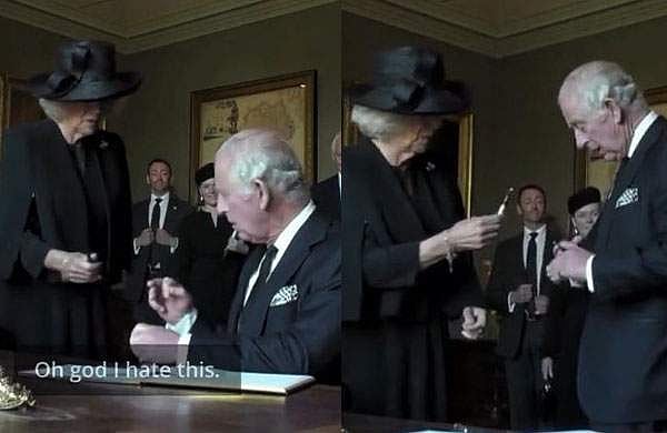 'ഓ ദൈവമേ, ഞാന് ഈ പേനയെ വെറുക്കുന്നു' എന്ന് പറഞ്ഞ് ഇരിപ്പിടത്തില് നിന്ന് എഴുന്നേറ്റ ചാള്സ് ഭാര്യ കാമിലയ്ക്ക് പേന കൈമാറുകയായിരുന്നു. കൈയിലാകെ പരന്ന മഷി തുടച്ചുകളയുന്നതും 'ഇതൊന്നും സഹിക്കാനാകില്ലെന്നു ചാള്സ് പിറുപിറുക്കുന്നതും വിഡിയോയില് ഉണ്ട്.