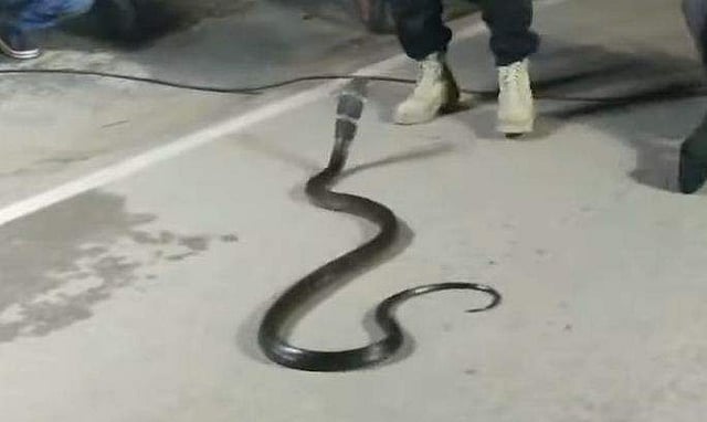 ഉടൻ തന്നെ സംഭവസ്ഥലത്തെത്തിയ സുരക്ഷാ ജീവനക്കാരാണ് മുറിയിലെ അലമാരയ്ക്കടിയിൽ പതുങ്ങിയിരുന്ന രാജവെമ്പാലയെ പിടികൂടിയത്. പിടികൂടിയ രാജവെമ്പാലയെ പരിശോധിച്ച ശേഷം ഇതിനെ വലിയ ബോക്സിനുള്ളിലാക്കി കൊണ്ടുപോയി.