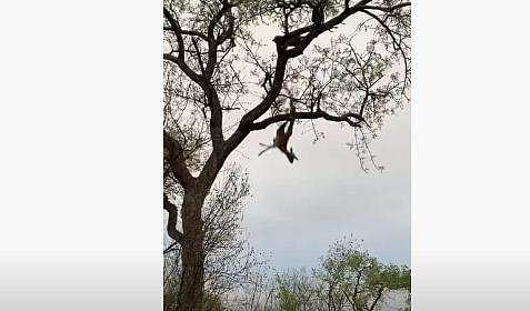 മറ്റു മൃഗങ്ങളുടെ ഉപദ്രവത്തില് നിന്ന് രക്ഷപ്പെടാന് പുള്ളിപ്പുലികള് പൊതുവേ വേട്ടയാടിയ ഇരകളെ മരത്തിന്റെ മുകളിലേക്ക് കൊണ്ടുപോയി ഭക്ഷിക്കുന്നതാണ് പതിവ്. ഇങ്ങനെ പിടികൂടിയ ഇരയുമായി മരത്തില് കയറിയ പുള്ളിപ്പുലിക്ക് പറ്റിയ അബദ്ധമാണ് ഇപ്പോള് സമൂഹമാധ്യമങ്ങളില് വ്യാപകമായി പ്രചരിക്കുന്നത്.
