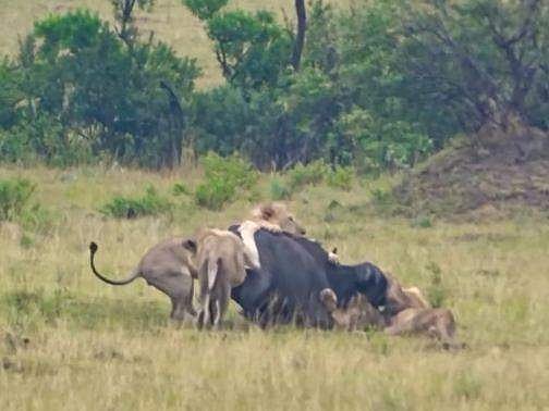 ഒറ്റയ്ക്കുള്ള പോരാട്ടം പരാജയപ്പെട്ട സിംഹം പിന്നീടെത്തിയത് സിംഹക്കൂട്ടത്തിനൊപ്പമാണ്. ഇത്തവണ സിംഹത്തിന്റെ കണക്കൂട്ടലുകള് പിഴച്ചില്ല. കാട്ടുപോത്തിന്റെ കൂട്ടത്തില് നിന്നും കൂറ്റന് കാട്ടുപോത്തിനെ തന്നെ സിംഹങ്ങള് ആക്രമിച്ചു കീഴടക്കി. എന്നാല് സിംഹക്കൂട്ടത്തെ ചെറുക്കാനായി കാട്ടുപോത്തുകള് മുതിര്ന്നുമില്ല.