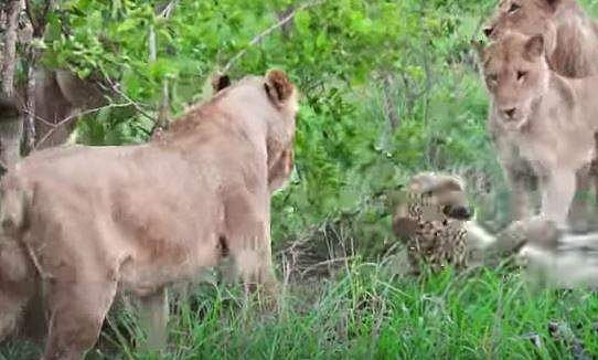 അപ്പോഴേക്കും സിംഹങ്ങളെല്ലാം ആ മരത്തിന് ചുറ്റുമായി നിലയുറപ്പിച്ചിരുന്നു. ഇതിനിടെ കൂട്ടത്തിലൊരു സിംഹം മരത്തിനു മുകളിലേക്ക് കയറാന് ശ്രമിക്കുന്നത് കണ്ട പരിഭ്രാന്തിയില് പുലി താഴേക്കു ചാടുകയും ചെയ്തു. ഇതോടെ സിംഹങ്ങളെല്ലാം ചേര്ന്ന് അവസരം പാഴാക്കാതെ പുലിയെ വളഞ്ഞാക്രമിക്കുന്നതാണ് വീഡിയോയുടെ ഉള്ളടക്കം.ഏതാണ്ട് അരമണിക്കൂര് നേരം പുള്ളിപ്പുലി സിംഹങ്ങളെ നേരിട്ടു. ഒടുവില് ഒരു പെണ് സിംഹമാണ് പുലിയുടെ കഴുത്തില് കടിച്ച് അതിനെ കീഴടക്കിയത്.