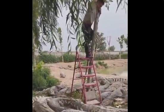 അൻപതിലധികം മുതലകൾക്കു മുന്നിൽ അകപ്പെട്ടു പോയ ഒരു വ്യക്തിയാണ് വിഡിയോയിലുള്ളത്. ഒത്തു കിട്ടിയാൽ ആക്രമിക്കാനായി തക്കം പാർത്തിരിക്കുന്ന മുതലകളുടെ വായിൽ നിന്നും രക്ഷപെടാൻ ഏണിയിൽ കയറി നിൽക്കുകയാണ് ഇയാൾ. ഏണിയുടെ താഴെയായി കൂട്ടത്തോടെ നിൽക്കുന്ന മുതലകളുടെ ചലനത്തിൽ താഴെ വീഴാതിരിക്കാനായി തൊട്ടടുത്ത മരത്തിൽ ഇയാൾ മുറുകെ ചുറ്റിപ്പിടിച്ചിട്ടുമുണ്ട്. അബദ്ധത്തിൽ ഒന്ന് പിടിപെട്ടാൽ മുതലകൾക്ക് നടുവിൽ വീണ് ജീവൻ നഷ്ടപ്പെടുമെന്ന് ഉറപ്പ്. ഈ കാഴ്ച കണ്ടുനിന്ന ചിലരാണ് ദൃശ്യങ്ങൾ പകർത്തിയിരിക്കുന്നത്. ഭയത്തോടെ ആളുകൾ നിലവിളിക്കുന്നതും വിഡിയോയിൽ കേൾക്കാം.