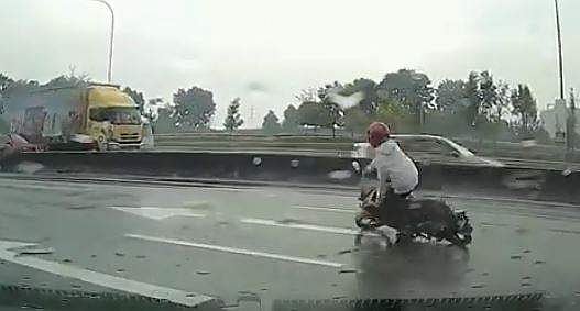 റോഡില് തെറിച്ചുവീണ സമയത്ത് തന്നെ പിന്നില് നിന്ന് ലോറി വരുന്നത് കണ്ട് ബൈക്ക് യാത്രക്കാരന് ഓടി മാറിയത് കൊണ്ടാണ് ജീവന് രക്ഷിക്കാന് സാധിച്ചത്. മുന്നിലുള്ള ബൈക്ക് തെറിച്ചുവീഴുന്നത് പ്രതീക്ഷിക്കാതിരുന്ന ട്രക്ക് ഡ്രൈവറിന് വാഹനം ഉടന് തന്നെ നിര്ത്താന് സാധിച്ചില്ല. ലോറി വരുന്നത് കണ്ട് ബൈക്ക് യാത്രക്കാരന് ഓടി മാറിയത് കൊണ്ടാണ് രക്ഷപ്പെട്ടത്.