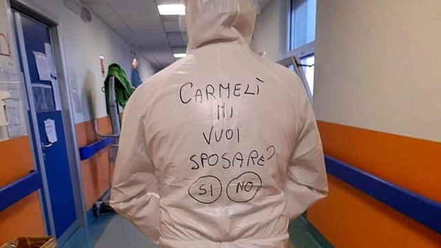 ഇറ്റലിയിലെ മെയിൽ നഴ്സായ ജോസഫ് പൻജൻറ് ആണ് കാമുകിയോട് ഹൃദയം തുറന്നത്. കോവിഡ് സുരക്ഷ കവചമായ പിപിഇ കിറ്റിൻറെ പുറകിൽ 'കാർമലി നിങ്ങൾക്കെന്നെ വിവാഹം ചെയ്യാമോ' എന്നെഴുതിയായിരുന്നു ജോസഫ് തന്റെ പ്രണയം തുറന്നുപറഞ്ഞത്. ഫേസ്ബുക്കിലൂടെയാണ് വ്യത്യസ്തമായ രീതിയിൽ വിവാഹാഭ്യർഥന നടത്തിയത്. കാർമലിയുടെ അഭിപ്രായം അറിയാൻ 'യെസ്' അല്ലെങ്കിൽ 'നോ' എന്ന് രണ്ട് ഓപ്ഷനുകളും നൽകിയിട്ടുണ്ട്.