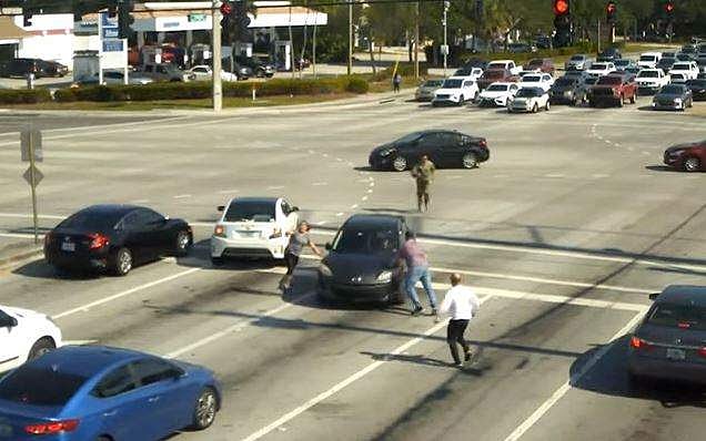 ഫ്‌ളോറിഡയില്‍ കഴിഞ്ഞദിവസമാണ് സംഭവം നടന്നത്. സിഗ്നനില്‍ നിന്ന് കാര്‍ മുന്നോട്ടുനീങ്ങുന്നതാണ് വീഡിയോയുടെ തുടക്കം. ഈസമയത്ത് മറ്റൊരു കാറില്‍ ഉണ്ടായിരുന്ന യാത്രക്കാരന്‍ പുറത്തിറങ്ങി മറ്റു യാത്രക്കാരുടെ ശദ്ധയില്‍പ്പെടുത്താന്‍ ശ്രമിക്കുന്ന വീഡിയോ പുറത്തുവന്നിട്ടുണ്ട്.