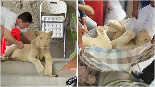 ഉടമസ്ഥനൊപ്പവും വളര്ത്തുനായയ്ക്കൊപ്പവും സിംഹം ഇരിക്കുന്നതിന്റെ ചിത്രങ്ങളും വിഡിയോകളുമാണ് സമൂഹമാധ്യമങ്ങളില് പങ്കുവച്ചിരുന്നത്. 70 കിലോഗ്രാമാണ് ഇപ്പോള് സിംഹത്തിന്റെ ഭാരം. പിടികൂടിയ സിംഹത്തെ പനോം താമാവോയിലുള്ള വന്യജീവി സുരക്ഷാ കേന്ദ്രത്തിലേക്ക് മാറ്റി.