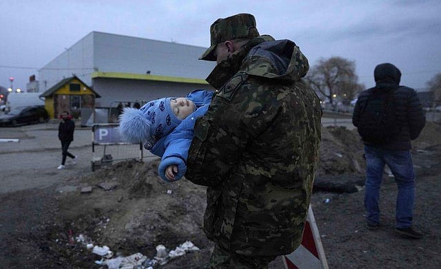 യുക്രൈന്‍ അഭയാര്‍ത്ഥിസംഘത്തിലെ കുട്ടിയെ കൈയിലെടുത്ത് സൈനികന്‍/ പിടിഐ ചിത്രം