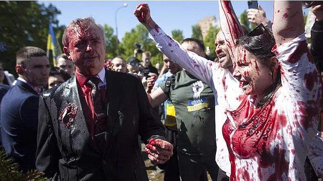സോവിയറ്റ് സൈനികര്‍ക്ക് ആദരം അര്‍പ്പിക്കാനെത്തി; റഷ്യന്‍ അംബാസിഡര്‍ക്ക് നേരെ പോളണ്ടില്‍ മഷിയേറ് (വീഡിയോ)