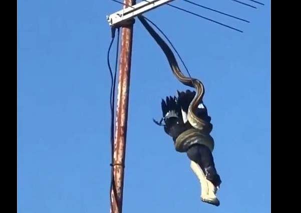 ഫുട്ബോള് ട്വീറ്റ്സ് എന്ന ട്വിറ്റര് ഹാന്ഡില് ആണ് വീഡിയോ പങ്കുവെച്ചിരിക്കുന്നത്. ടിവി ആന്റിനയില് തൂങ്ങിക്കിടക്കുകയാണ് പാമ്പ്. പാമ്പിന്റെ വായില് കാക്കയുടെ തലയുണ്ട്. ചത്ത നിലയിലാണ് കാക്ക. ഉടന് തന്നെ കാക്കയെ ചുറ്റിവരിഞ്ഞ് ഭക്ഷിക്കുന്നതാണ് വീഡിയോയുടെ ഉള്ളടക്കം.
