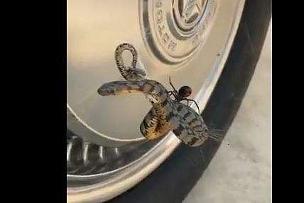 ഒരു വാഹനത്തിന്റെ ടയറിനോട് ചേര്ന്നാണ് ചിലന്തി വല. ഇതില് പാമ്പ് കുടുങ്ങി കിടക്കുന്നതാണ് വീഡിയോയില് വ്യക്തമാകുന്നത്.