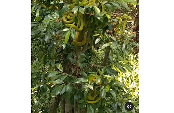 ഒരു മരത്തില് വള്ളിച്ചെടികള് പടര്ന്നുപിടിച്ച് കിടക്കുന്നത് പോലെ ചുറ്റി പിണഞ്ഞ് കിടക്കുന്ന പാമ്പിന് കൂട്ടമാണ് ചിത്രത്തിലുള്ളത്. വിയറ്റ്നാം ഡോങ് താം സ്നേക് ഗാര്ഡനിലെ ചിത്രങ്ങളാണ് വീഡിയോയിലുള്ളത്.