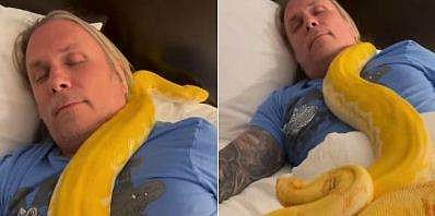 സ്നേക്ബൈറ്റ്സ്ടിവി എന്ന ഇന്സ്റ്റാഗ്രാം പേജിലാണ് വീഡിയോ പങ്കുവെച്ചിരിക്കുന്നത്. മഞ്ഞ നിറത്തിലുള്ള കൂറ്റന് പെരുമ്പാമ്പുകള് ശരീരത്തുകൂടി ഇഴഞ്ഞുനീങ്ങുമ്പോഴും ഒന്നുമറിയാത്തെ പോലെ കിടന്നുറങ്ങുന്നത് സാമൂഹിക മാധ്യമങ്ങളെ അമ്പരപ്പിക്കുകയാണ്. മെക്സിക്കന് ബ്ലാക്ക് കിങ്സ്നേക് ഇനത്തില്പ്പെട്ട പാമ്പാകാമെന്നാണ് സാമൂഹിക മാധ്യമങ്ങളിലെ കമന്റ്.