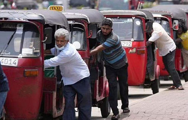 കൊളംബോയിലെ ഒരു പമ്പിന് സമീപം പെട്രോൾ വാങ്ങാൻ ശ്രീലങ്കൻ ഓട്ടോ റിക്ഷാ ഡ്രൈവർമാർ ക്യൂ നിൽക്കുന്നു