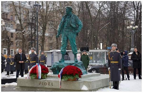 മോസ്കോയിലെ സോകോല് ജില്ലയിലെ ഫിഡല് കാസ്ട്രോ സ്ക്വയറിലാണ് മൂന്നു മീറ്റര് ഉയരമുള്ള വെങ്കല പ്രതിമ സ്ഥാപിച്ചിരിക്കുന്നത്. ചുവന്ന റോസാപൂക്കള് കൊണ്ട് തയ്യാറാക്കിയ ഒരു ബൊക്കെയും ഇരു നേതാക്കളും പ്രതിമയ്ക്ക് ചുവട്ടില് സമര്പ്പിച്ചു.