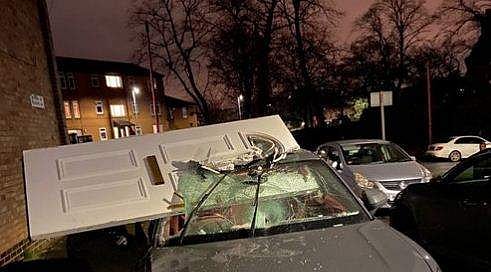 യോര്‍ക്ക്ഷയറിലാണ് സംഭവം. 18 വയസുകാരന്‍ ഓടിച്ച കാര്‍ മറ്റൊരു കാറുമായി കൂട്ടിയിടിച്ചു. തുടര്‍ന്ന് നിയന്ത്രണംവിട്ട കാര്‍ വീട്ടില്‍ ഇടിച്ചുകയറുകയായിരുന്നു. അതിനിടെയാണ് പൊളിഞ്ഞുവീണ മുന്‍വശത്തെ വാതില്‍ കാറിന്റെ മുന്‍വശം തകര്‍ത്തത്.