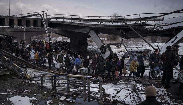 റഷ്യന്‍ ആക്രമണത്തില്‍ തകര്‍ന്ന ഇര്‍പിനില്‍ നിന്നും ജനങ്ങളെ ഒഴിപ്പിക്കുന്നു/ പിടിഐ