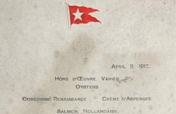 വെള്ള നിറമുള്ളതും വൈറ്റ് സ്റ്റാര് ലോഗോയുമുള്ള മെനു ഉരുളക്കിഴങ്ങ്, അരി, പാഴ്സ്നിപ്പ് പ്യൂരി എന്നിവയ്ക്കൊപ്പം ചിപ്പി, സാല്മണ് മത്സ്യം, ബീഫ്, പ്രാവ്, താറാവ്, ചിക്കന് എന്നിവ അടങ്ങുന്നതായിരുന്നു.