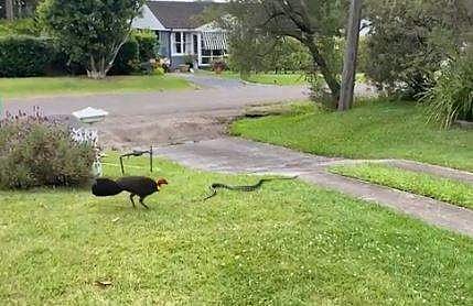 ഓസ്‌ട്രേലിയയിലാണ് സംഭവം നടന്നത്. പുല്‍ത്തകിടിയിലൂടെ ഇഴഞ്ഞു നീങ്ങുന്ന പെരുമ്പാമ്പിനെ കൊത്തിയോടിക്കുന്ന ടര്‍ക്കിയുടെ ദൃശ്യമാണിത്.പാമ്പിനെ വിടാതെ പിന്തുടര്‍ന്ന് ടര്‍ക്കി അതിനെ തുരത്തുകയായിരുന്നു. കുഞ്ഞുങ്ങളുടെ അരികിലേക്ക് എത്താതിരിക്കാനാണ് ടര്‍ക്കി പാമ്പിനെ ആക്രമിച്ചത്.