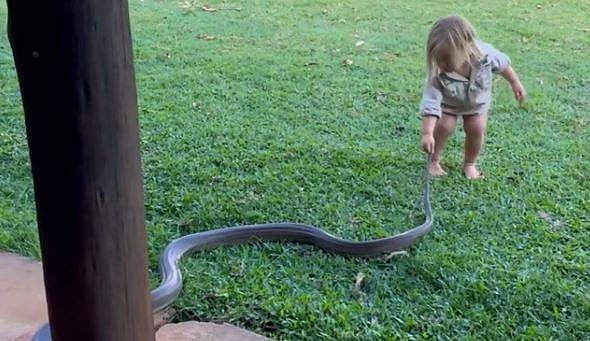 എന്നാല് ഇത് യഥാര്ത്ഥ പാമ്പല്ല. റബര് കൊണ്ട് ഉണ്ടാക്കിയ കളിപ്പാട്ടമാണ്. മുതലകളെ പിടികൂടുന്നതില് വൈദഗ്ധ്യം തെളിയിച്ച മാറ്റ് റൈറ്റാണ് മകനെ റബര് പാമ്പ് ഉപയോഗിച്ച് കളിപ്പിച്ചത്. കൂറ്റന് പാമ്പുകളെ പിടികൂടുന്നതില് ചെറുപ്പത്തില് തന്നെ കുട്ടിയെ അഭ്യസിപ്പിക്കുന്നതിന് വേണ്ടിയാണ് റബര് പാമ്പിനെ കൊണ്ടുവന്നത്.