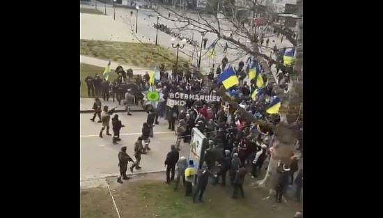 ഈസ്റ്റേൺ യൂറോപ്യൻ മീഡിയ ഔട്ട്ലെറ്റാണ് വീഡിയോ പുറത്തുവിട്ടത്. വീഡിയോയിൽ നൂറുകണക്കിന് വരുന്ന ജനങ്ങൾ യുക്രൈൻ പതാകയും ഉയർത്തി റഷ്യയുടെ കടന്നുകയറ്റത്തിനെതിരെ പ്രതിഷേധിക്കുന്നത് കാണാം. തുടർന്ന് ചില ആയുധധാരികൾ ഇവരെ പിരിച്ചുവിടാനായി ആകാശത്തേക്ക് വെടിയുതിർക്കുന്നതും വീഡിയോയിലുണ്ട്.